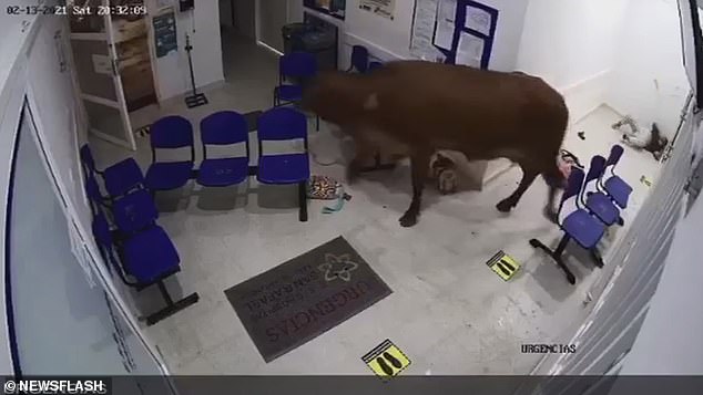 Колумбияда жаалданган уй ооруканага кирип кетип, ал жерде дарыгерге көрүнүү үчүн кезекте отургандарды сүзгүлөп кирген.