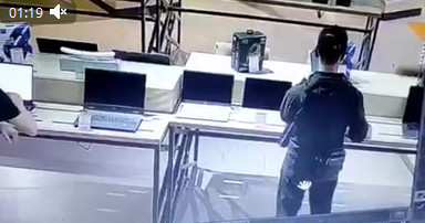 Кадрдан жаш жигиттин акыркы үлгүдөгү Apple MacBook үлгүсүндөгү ноутбуктун капкагын жаап, анан келгендердин көзүнчө баштыкка салып, дүкөндөн чыгып кеткен.