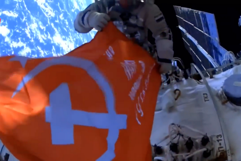 Орусиянын космонавттары 9-май майрамынын алдында Улуу Ата Мекендик согуштагы Жеңиш туусунун көчүрмөсүн ачык космоско чыгарышты.