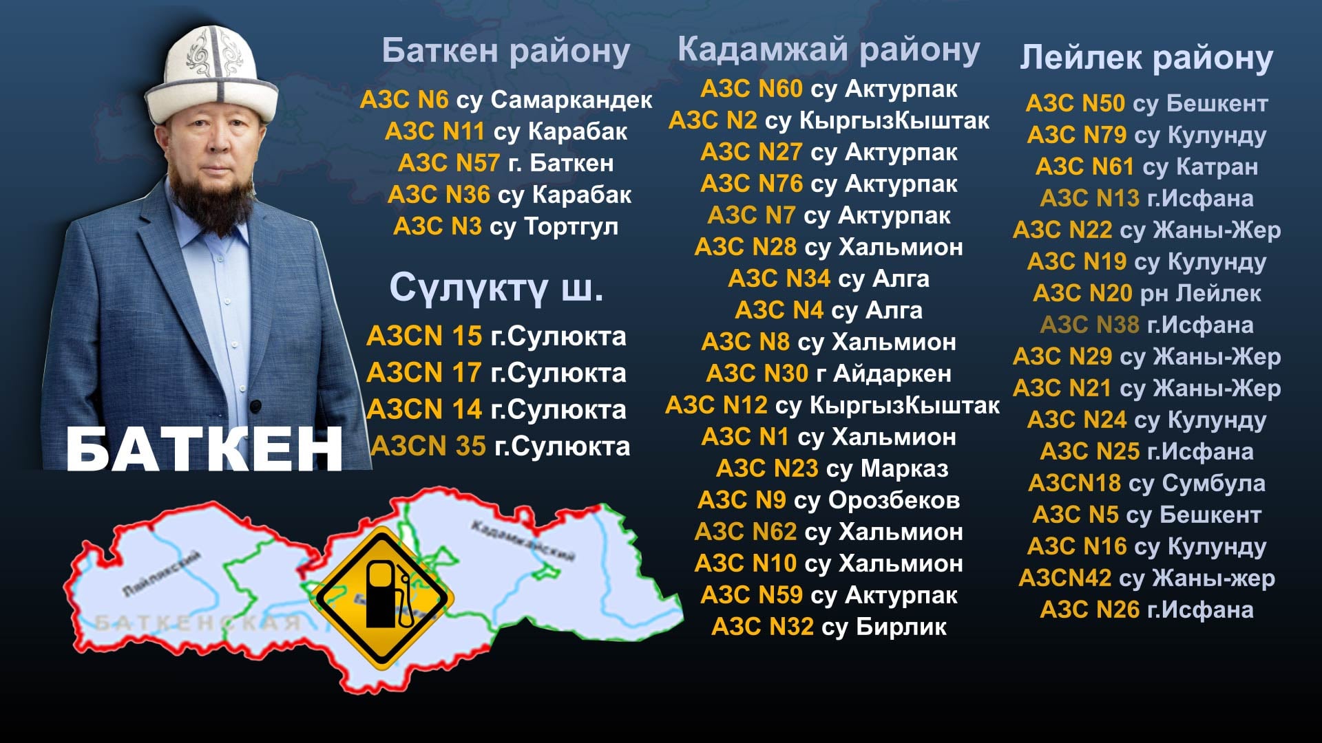 Парламенттин депутаты Аккулу Бердиевге таандык «Север-Югойл» компаниясынын Кыргызстан боюнча «Асман-Ойл» деп аталган 80дей мунай бекеттери бар.