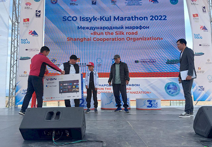 Ысык-Көл марафонунда Эл аралык марафон дирекциясынын директору Мелис Надырбеков Кубаныч Эшимбетовго телевизор тапшырды.