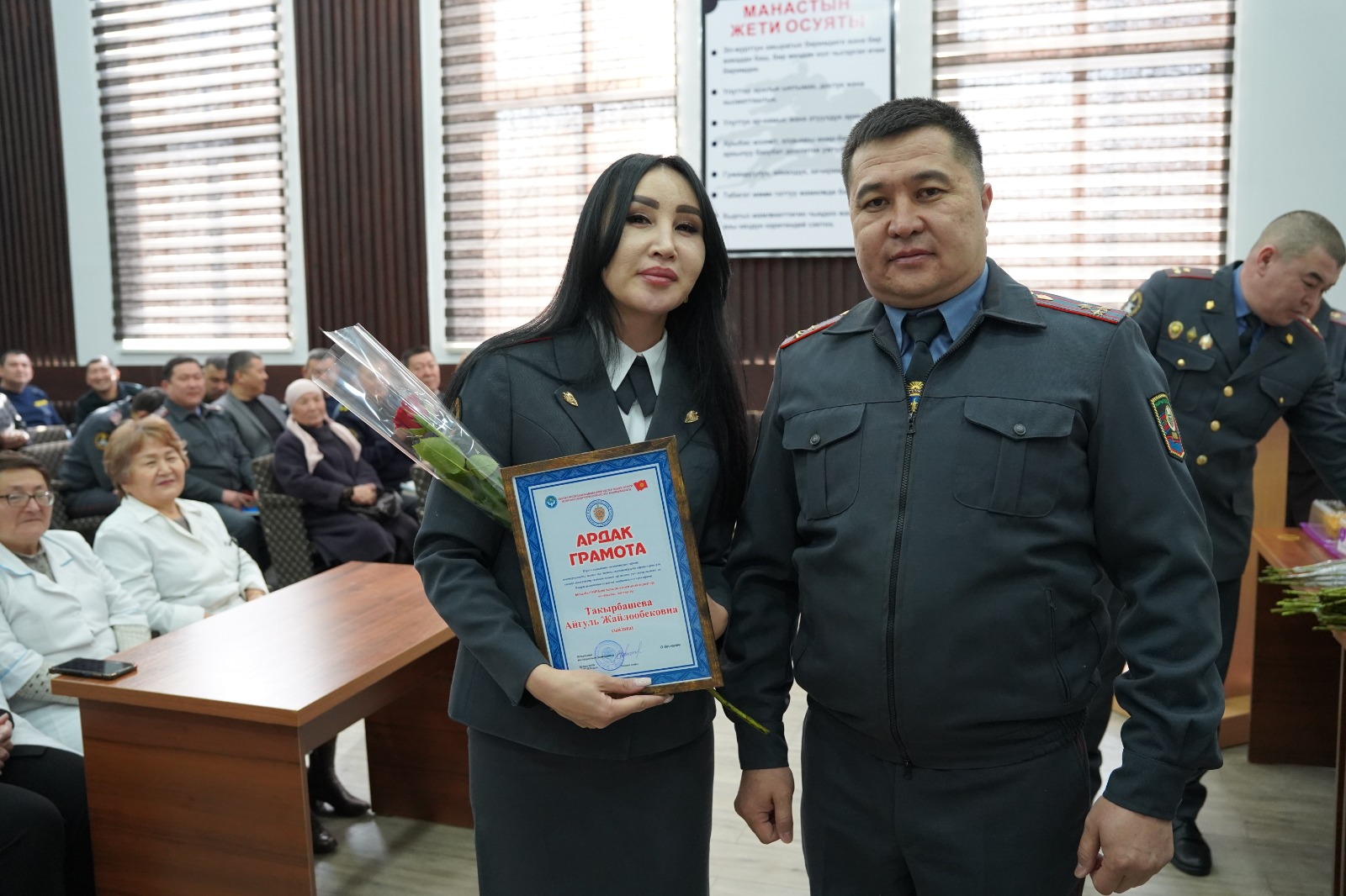 Облустук милициянын башчысы Орунбай Кочоров куттуктоо сөзүн сүйлөп, жарандардын тынчтыгын жана коопсуздугун коргоп, эркектер менен бирдей кызмат өтөп жаткан аял-милиционерлердин эрдигин жана жан аябастыгын өзгөчө белгиледи. Аларга чың ден соолук, үй-бүлөлүк бакубатчылык жана кызматында ийгиликтерди каалады.