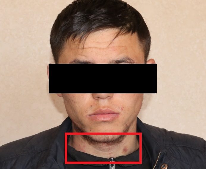 Бул жаран Токтогул РИИБдин Өзгөрүш айылдык милиция бөлүмүнүн кызматкерлери тарабынан кармалып аталган бөлүмгө алып барылган. Ошол учурда тартылып алынган сүрөттөрдө шектүүнүн мойнунда тактары бар экендигин байкоого болот. Ошондой эле мал сатып алган жарандар тарабынан тартылган сүрөттө дагы мойнундагы тактары байкалган. Шектүү жаран болжол менен 1 саат 30 мүнөттөй кармалып, Талас ШИИБдин кызматкерлерине өткөрүп берилген.