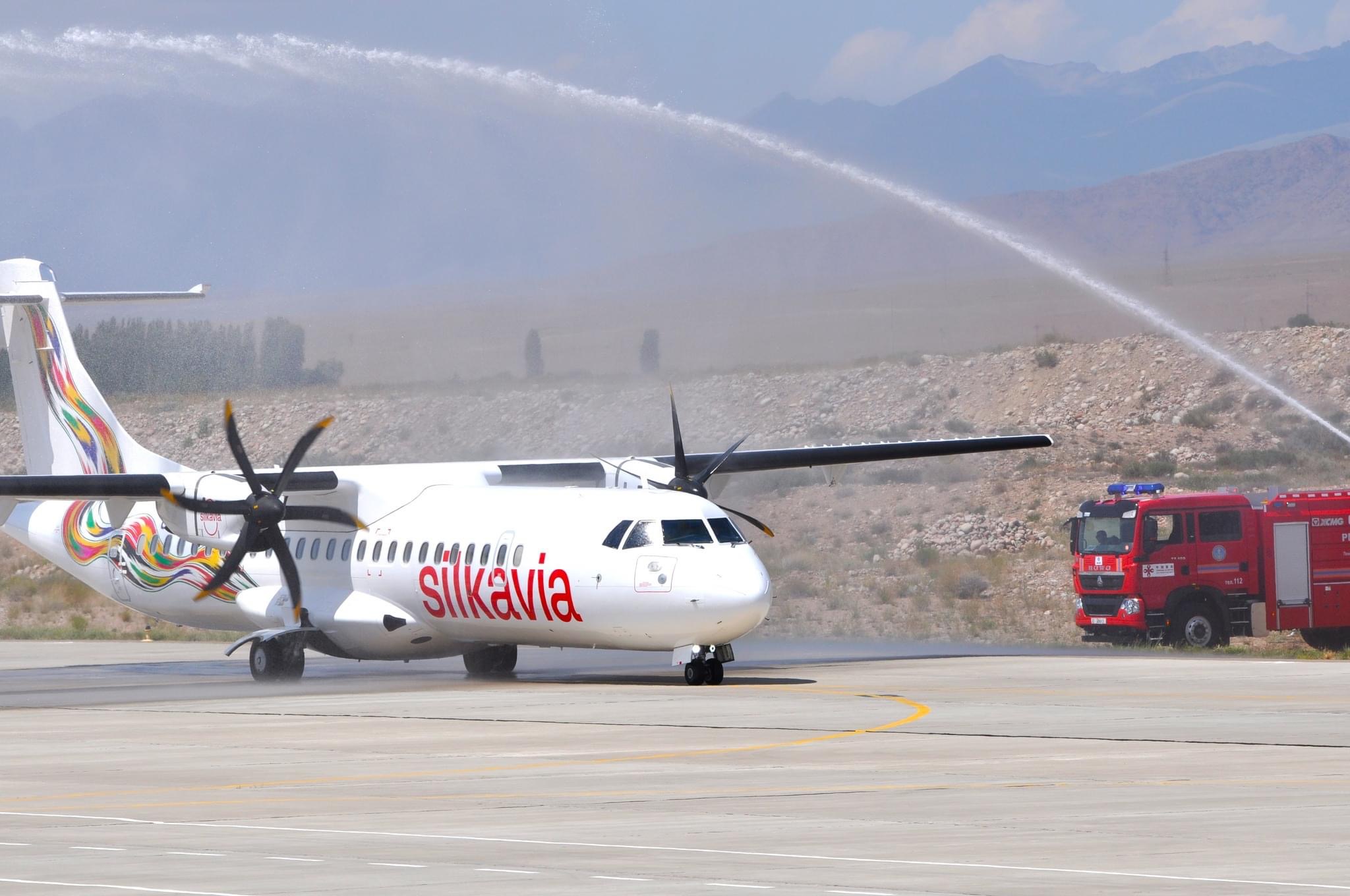 Салт боюнча "Silk Avia" авиакомпаниясынын ATR 72-600 учагын суу аркасы менен тосуп алышты.