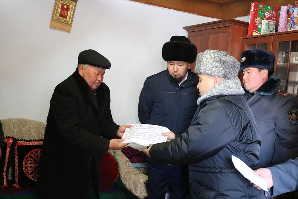 Ошондой эле Нургазынын артында калган кыздары Айпери,Мээрим, Сайкал, жана уулу Элмырза силер сабырдуу болуп, жакшы окуп, көзү өткөн ата-энеңердин аткарбай калган иштерин аткарууга аракет кылышыңар керек, силер жалгыз эмессиңер силер менен областтык ички иштер кызматкерлери дайыма силер менен бирге жана жаныңарда болобуз-деп өзүнүн атынан жана өздүк курамдын атынан 205 миң 600 сом акчалай жардам көрсөтүп Нургазынын атасына тапшырды.