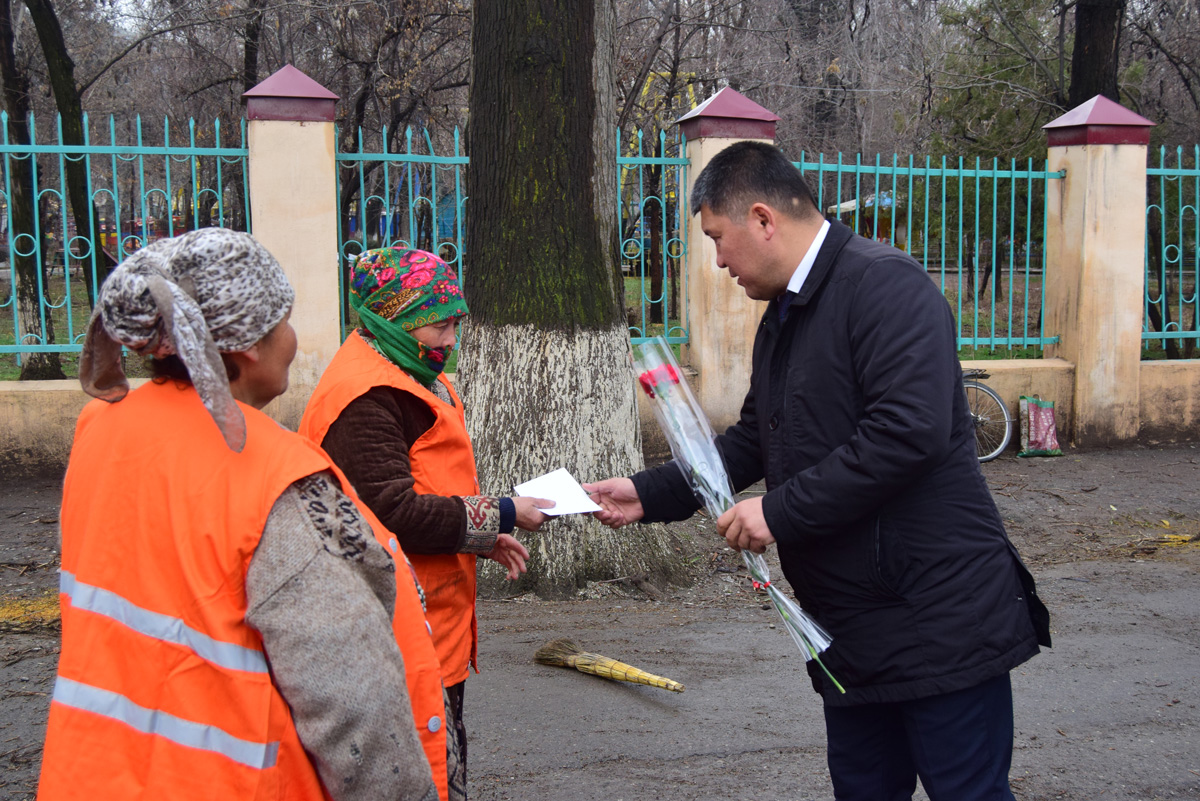 Жалал-Абад шаарынын мэри Мураталы Тагаев 8-март - Аялдардын эл аралык майрамын утурлай, калаадагы тазалык жана жашылдандыруу кызматында эмгектенген аялдарды иш үстүндө барып куттуктап, майрамдык маанай тартуулады.