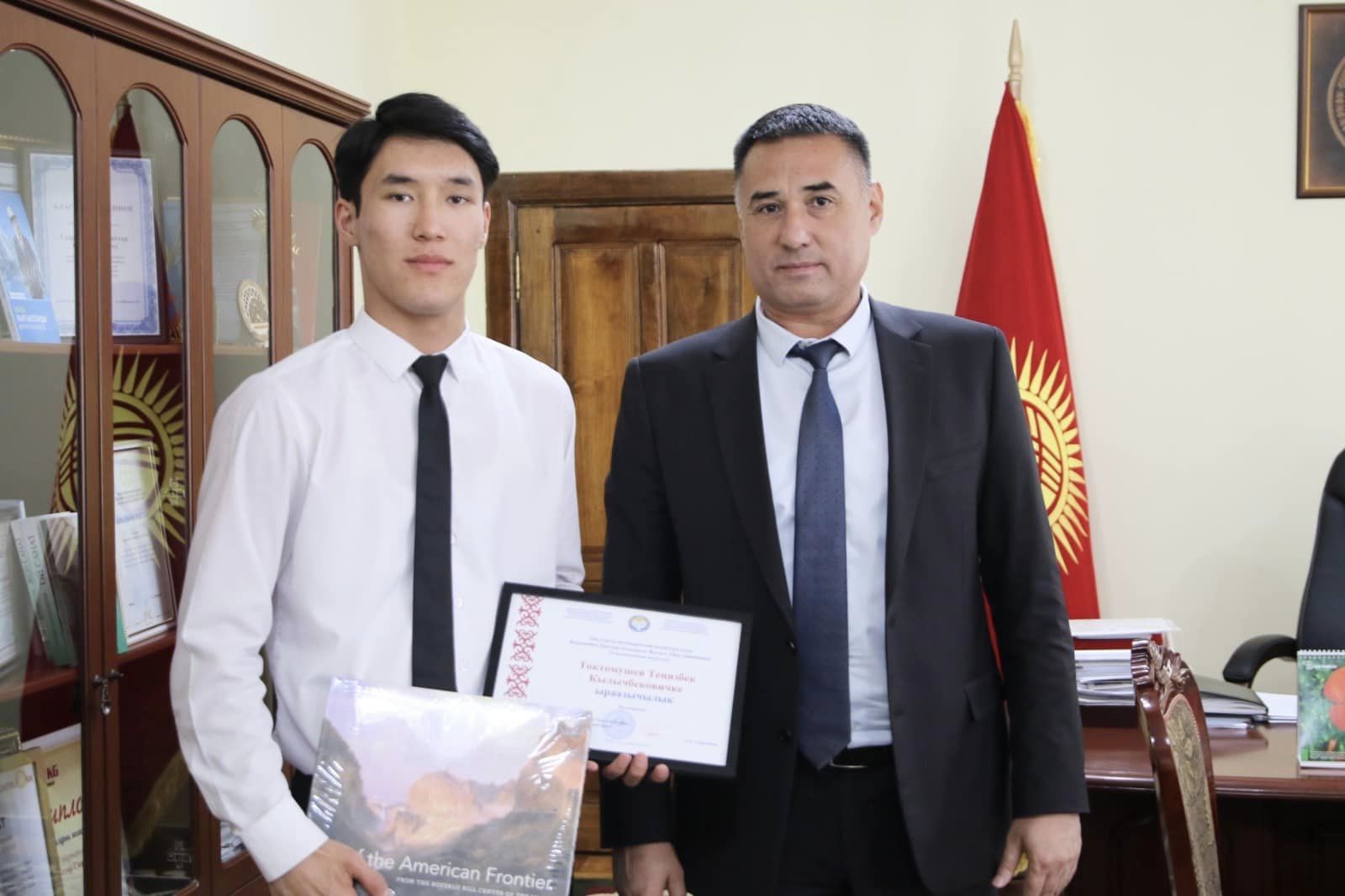 Президенттин Жалал-Абад облусундагы өкүлү Абсаттар Сыргабаев АКШнын 10 университетине окууга өтүп, 1 млн доллар грант утуп алган бүтүрүүчү Теңизбек Токтомушевди кабыл алды.
