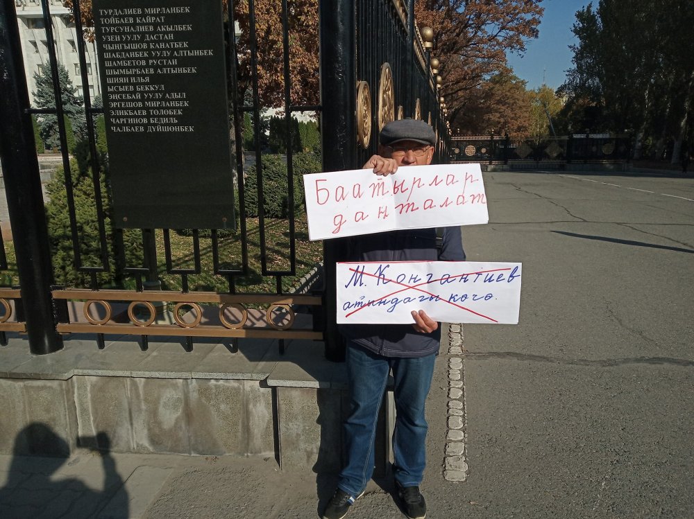 Коомубузда билсеңер, жалгыз митингчиби же пикетчиби айтор ким билсин, жалгыз чыккан адамды дагы ким деп коёт белгисиз. Кандай гана көйгөйлүү маселе болбосун, дайым нааразычылык акциясына жалгыз чыгып, башкалардан өзгөчөлөнүп турган Өндүрүш Токтонасыров бүгүн дагы Ак үйдүн алдына чыгып, “буркурап бир көз жашын төгүп” алды. Ал дал ушул Конгантиевдин ысымы көчөлөрдүн бирине ыйгарылгандыгына нааразы экен.