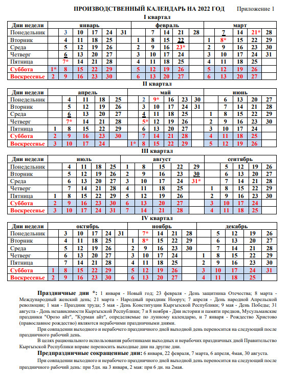 Эмгек, социалдык коргоо жана миграция министрлиги жаңы 2022-жылга карата өндүрүштүк календарды бекитти.