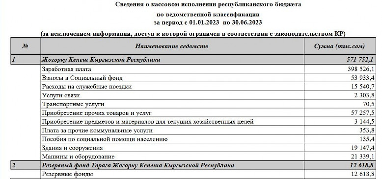 Жыл башынан бери Жогорку Кеңештин чыгымдарын каржылоого бюджеттен 571 млн 752,1 миң сом бөлүнгөн. Бул тууралуу Финансы министрлигинин 1-январдан 30-июнга чейинки республикалык бюджеттин кассалык аткарылышы боюнча отчетунда айтылат.