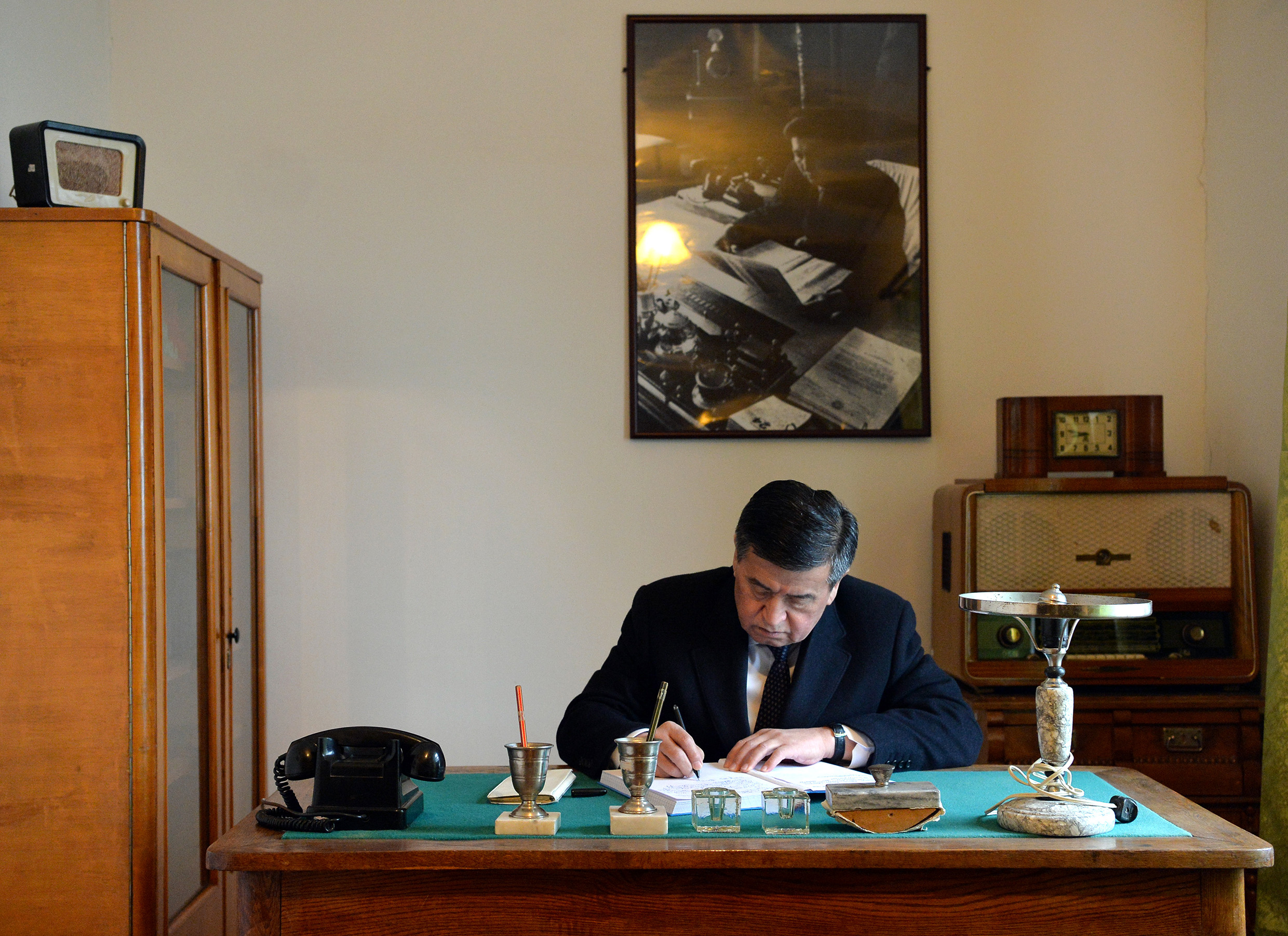 Мамлекет башчысы музейдин экспонаттарын көрүп чыгып, меймандар китебинде кол жазмасын калтырды.