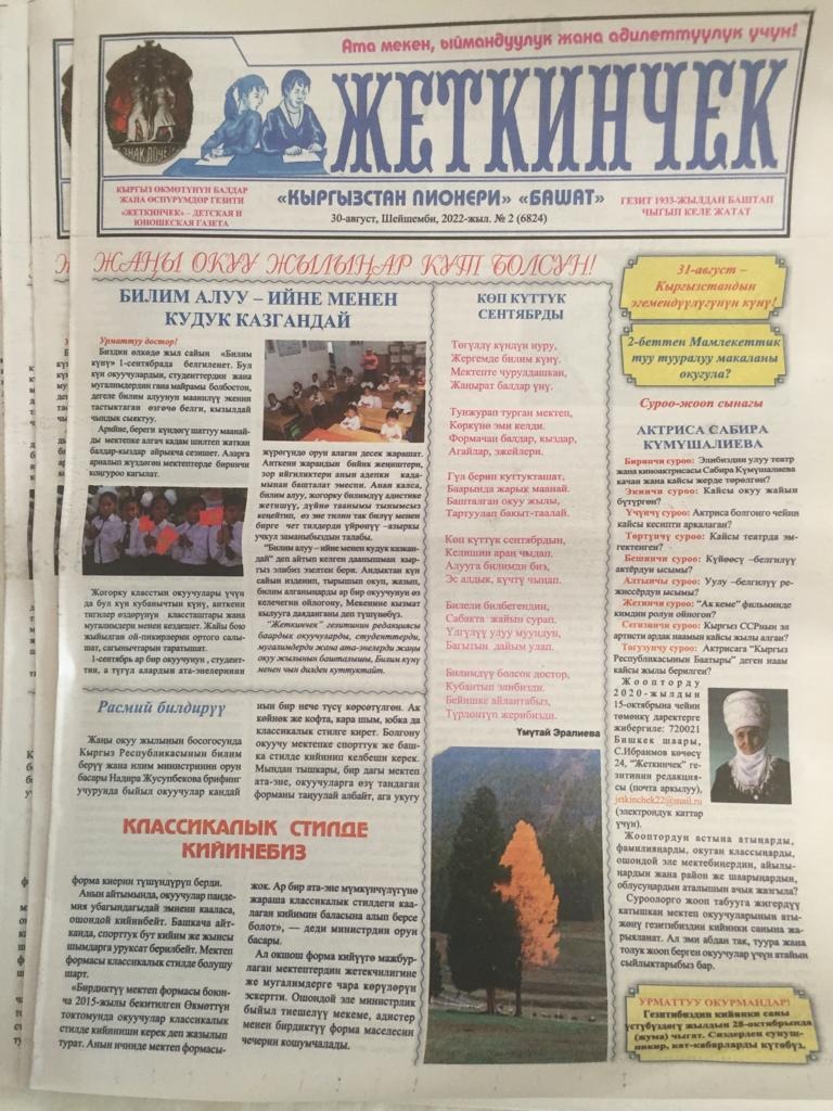 «Балдардын жана өспүрүмдөрдүн республикалык «Жеткинчек» гезитин (мурдагы «Кыргызстан пионери») кайрадан калыбына келтирүү иши улантылып жатат. Маалым болгондой, береги басылманын басылып чыгышы жана окурмандарга тарашы кийинки жылдары ар кандай себептерге байланыштуу абдан солгундап кеткен.