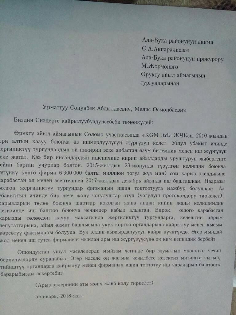 Эсиңиздерде болсо 5-Январь күнү Жой-Белент айылынын тургундары Соломо участкасында иштеп жаткан "KGM LTD " компаниясына нааразычылыктарын билдирип, Ала-Бука районунун акими С.Абдылдаевичке жана Ала-Бука районунун прокурору М.Жормоновго кайрылуу жөнөтүшкөн эле.