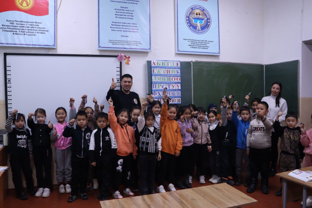 Милиция кызматкерлери мектеп окуучуларына «Жолдо жүрүм-турум эрежелери жана чагылдыруучу элементтер» деген темада сабак өтүшүүдө. Бул тууралуу КР ИИМдин ГОБДБдан билдиришти.