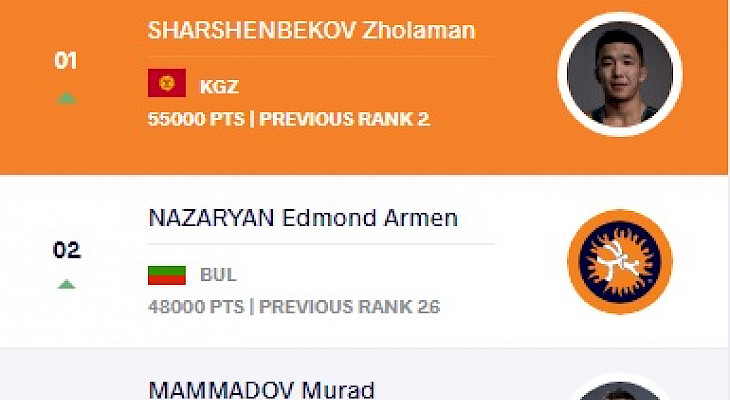 Шаршенбеков 60 кг салмакта грек-рим күрөшү боюнча рейтингде 55 миң упай менен экинчи орундан биринчиге көтөрүлдү. Ал эми Акжол Махмудов 77 кг салмакта 55 миң упай менен үчүнчү саптан экинчиге чыкты, 77 кг салмакта биринчи орунда түркиялык Юнус Башар турат.