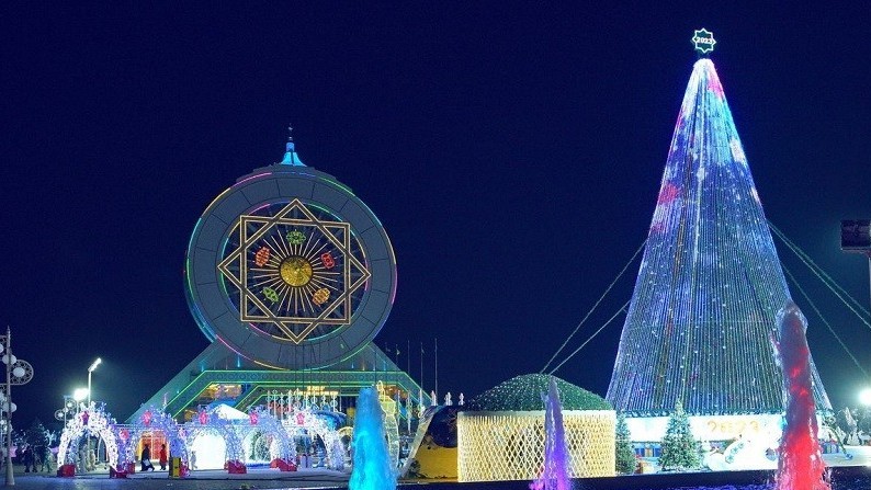 Огни на новогодней ели Ашхабада зажгли 15 декабря. Для украшения дерева понадобилось шесть тысяч шаров и игрушек. На площади вокруг елки – световые арки и десятки фигур сказочных персонажей.
