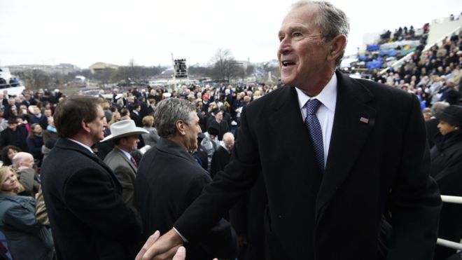 Джордж Буш-младший на инаугурации Дональда Трампа. Бывший президент США Джордж Буш-младший заявил, что Америке нужны ответы на вопросы о контактах команды Дональда Трампа с представителями России. Он также заступился за журналистов, которых ругает Трамп.