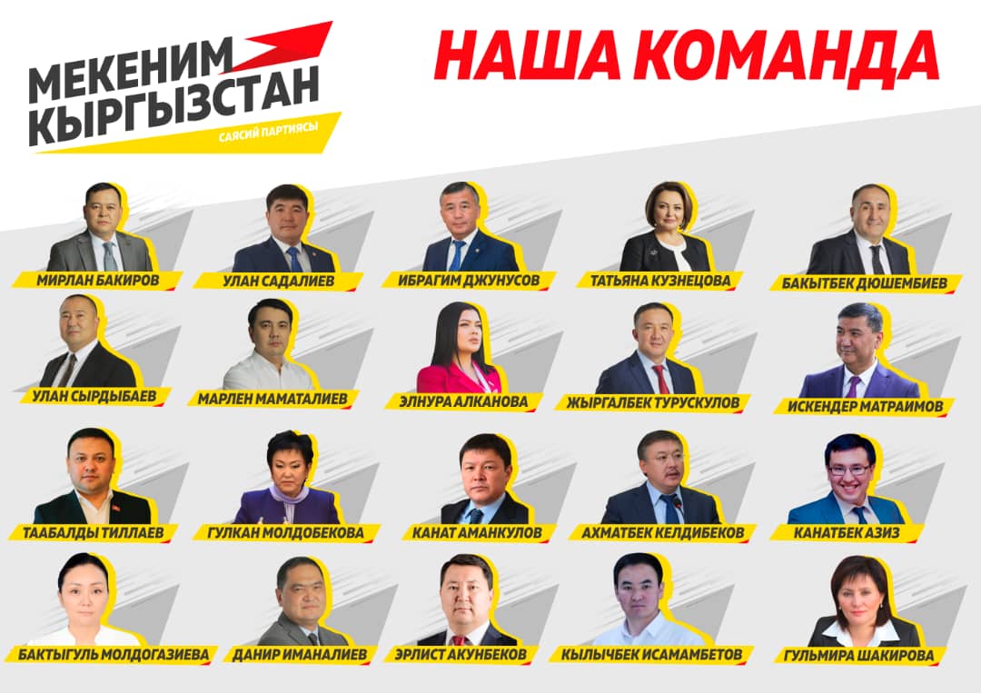 Партии сформировали свои списки. Одними из первых список имен кандидатов опубликовала партия «Мекеним Кыргызстан». Среди кандидатов есть несколько действующих депутатов парламента, но основной упор в политическом объединении сделали на новые лица. Так среди кандидатов есть известная своими расследования в сфере коррупции журналистка Элнура Алканова, юрист Канатбек Азиз, успешный предприниматель Кылыч Исамамбетов.