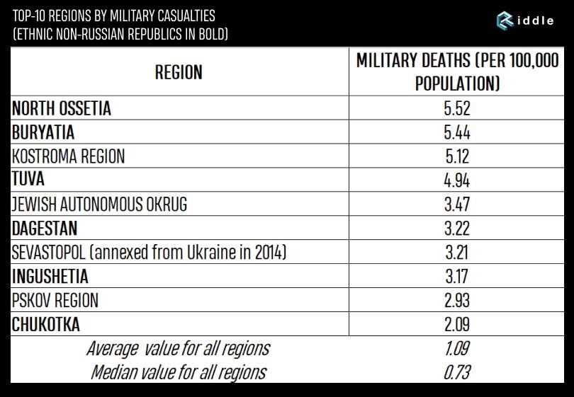 – Количество погибших на войне в Украине жителей различных регионов России в расчёте на 100 тысяч жителей – лидируют Северная Осетия, Бурятия, Кострома, Тыва и Еврейская АО – https://t.me/uniannet/50212