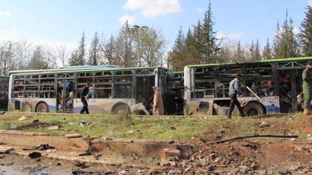 Однако эвакуацию пришлось отложить из-за вооруженного нападения на колонну автобусов с мирными жителями в деревнях Эль-Фуа и Кефрая в пригороде Идлиба. Взрыв бензоколонки при нападении привел к большому числу погибших.