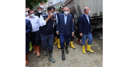 Президент Турции Реджеп Тайип Эрдоган прибыл в пятницу в район Бозкурт северной провинции Кастамону, где 11 августа проливные дожди спровоцировали селевые потоки, оползни и наводнения.