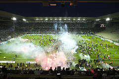 После окончания матча болельщики команды прорвались на поле и закидали игроков, тренеров и персонал стадиона файерами. Участникам встречи пришлось покинуть поле и укрыться в подтрибунном помещении.