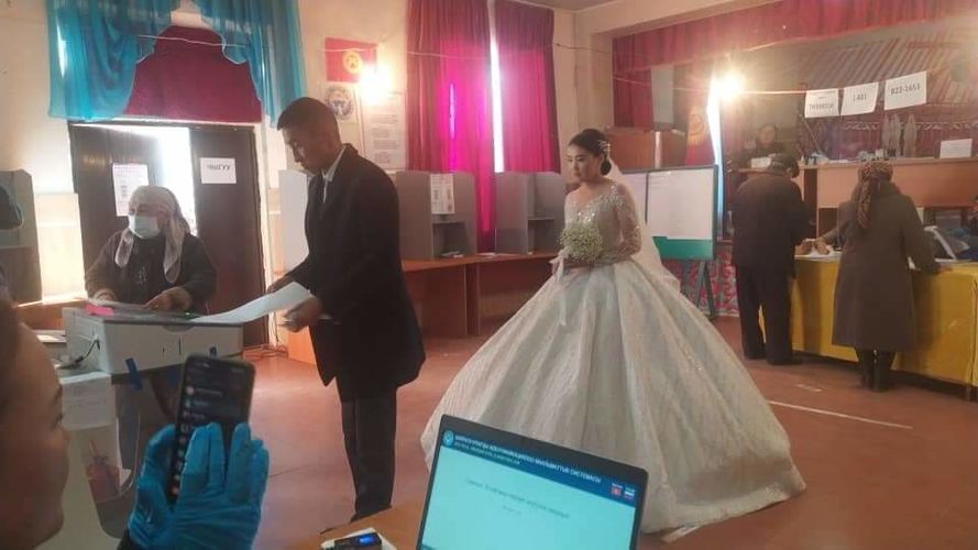 По словам пользователей, снимок сделали на одной из УИК Иссык-Кульской области. Девушка в свадебном платье и парень в костюме пришли, чтобы исполнить свой гражданский долг.