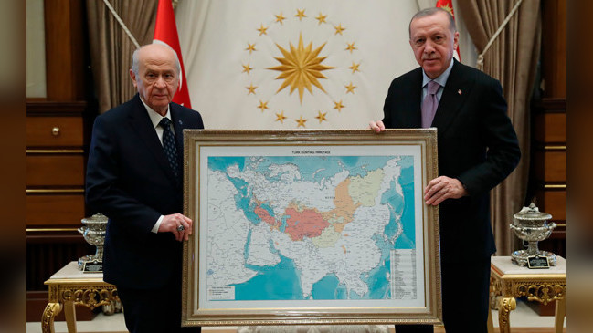 На карте Турция, Азербайджан, Туркменистан, Узбекистан, Казахстан, Кыргызстан и Таджикистан отмечены красным цветом. Вместе с тем оранжевым цветом обозначены некоторые страны Балканского полуострова, часть Ирана, южные регионы России, а также большая часть Сибири и западная часть Монголии. Желтым цветом помечены Алтай, Якутия и Синьцзян-Уйгурский автономный район Китая. В подписи к опубликованной фотографии не уточняется, что обозначают эти цвета. Как сообщает Cumhuriyet, Бахчели и Эрдоган встретились в президентском дворце турецкого лидера. Их встреча продлилась 45 минут. Никаких заявлений по итогам переговоров сделано не было. После встречи Бахчели покинул дворец и направился в штаб своей партии, пишет издание.