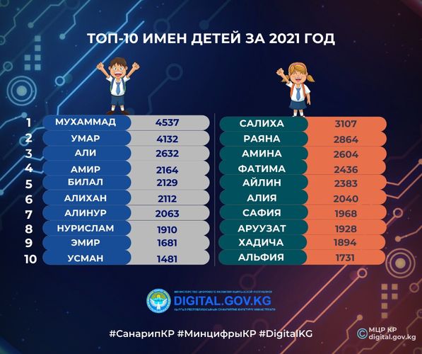 Самыми популярными именами для новорожденных в Кыргызстане в этом году являются Мухаммад и Салиха. Об этом сообщили в Министерстве цифрового развития.