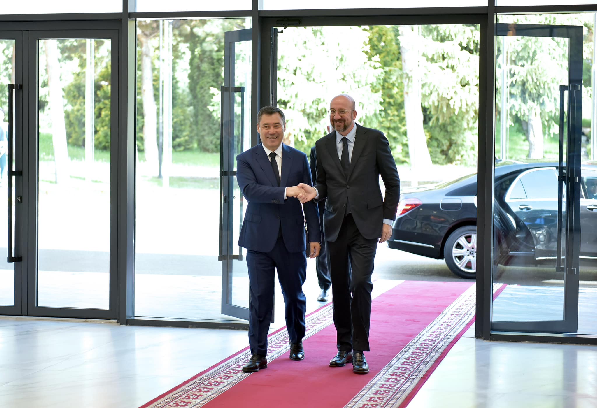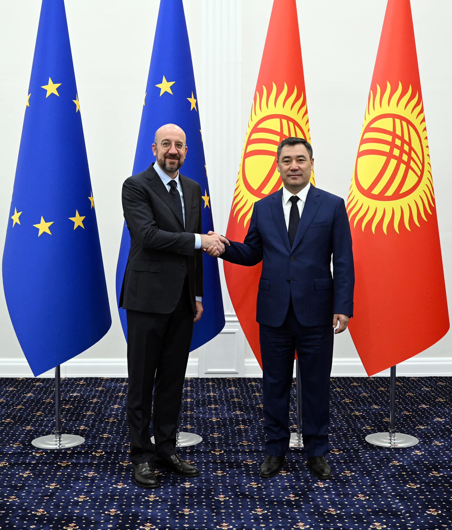 Глава государства, приветствуя Шарля Мишеля, поблагодарил его за принятие приглашения совершить официальный визит в страну. В частности, Садыр Жапаров подчеркнул его историческую значимость, так как впервые в истории двустороннего сотрудничества кыргызская сторона проводит столь высокий визит руководителя Европейского Союза в страну.