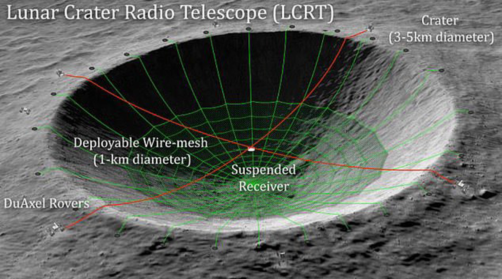 Проект Радиотелескопа Лунного Кратера (LCRT) — ультра-длинноволнового радиотелескопа, который будет расположен в одном из кратеров на противоположной стороне Луны, был предложен в 2018 году. Такой телескоп будет обладать огромными преимуществами по сравнению с телескопами, основанными на Земле и на орбите Земли, так как сможет наблюдать Вселенную на длинах волн, которые отражаются ионосферой Земли и до сих пор были не исследованы. Сама Луна будет действовать как физический экран, который изолирует телескоп от радиопомех от наземных источников, ионосферы, орбитальных спутников Земли и солнечных радиошумов в течение лунной ночи.