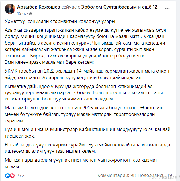 «Я нахожусь в неловком положении с того момента, как узнал о задержании моего советника. Честно говоря, когда его назначали моим советником, я хорошо его изучал, расспрашивал о нем. Но, к сожалению, случились такие вещи. Гражданин, которого 14 мая задержал ГКНБ, был назначен моим советником 26 апреля. Как я уже сказал, во время его назначения негативной информации о нем не было. Учитывая произошедшее, я принял решение освободить его от должности. Как стало известно, возбужденное дело произошло в 2016 году. Просьба не распространять разностороннюю информацию, связав прошлое с настоящим. Это дело не имеет никакого отношения ни к моей деятельности, ни к деятельности Кабинету министров. Прошу прощения за неудобства. На каких должностях я бы ни работал раньше, я работаю чисто для народа», - рассказал Кожошев.