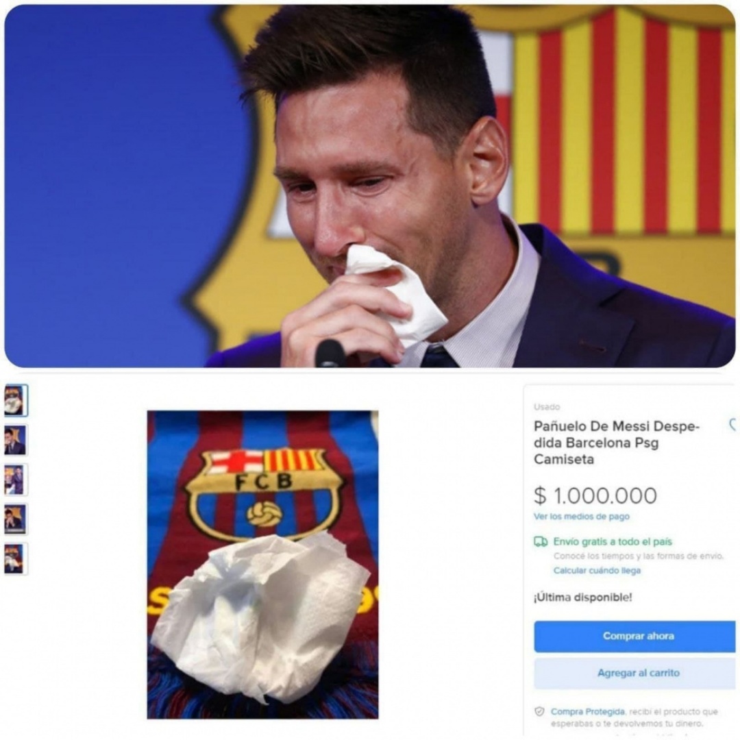 Бумажную салфетку, которой футболист Лионель Месси вытирал слезы на прощальной пресс-конференции, связанной с его уходом из «Барселоны», захотели продать за миллион долларов. Объявление появилось на платформе Mercado Libre.