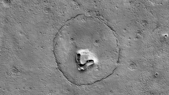 Марсианский разведывательный спутник NASA (MRO — Mars Reconnaissance Orbiter) сделал фотографию поверхности планеты, на которой можно увидеть рельеф, похожий на морду медведя. Фото опубликовано на сайте планетарной лаборатории университета Аризоны.