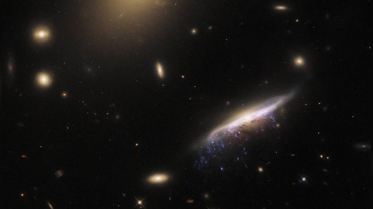 Космический телескоп NASA Хаббл сфотографировал «галактическую медузу». На снимке изображена яркая спиральная галактика. Под ней простираются пятнистые голубые потоки звездообразующего газа, похожие на щупальца. Это – участки звездообразования .