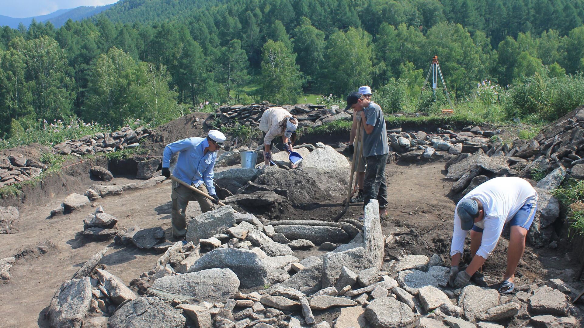 По информации руководителя экспедиции, эксперта Научно-образовательного центра алтаистики и тюркологии "Большой Алтай", профессора Сергея Грушина, эту находку сделали на могильнике афанасьевского времени, который начинали копать еще три года назад. По его словам, мегалитическое погребальное сооружение сложено из крупных каменных плит высотой до полутора метров, которые вкапывались вертикально на полметра в грунт. Внутри такой ограды помещалось погребение, которое сверху накрывалось крупными каменными блоками.