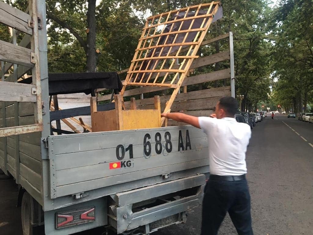 Специалистами отдела экономики и финансов Первомайского акимиата совместно с представителями управления землепользования и строительства и спецподразделения МП «Тазалык» провели очередное рейдовое мероприятие по демонтажу незаконно установленных объектов облегченного типа и игровых конструкций на центральной площади Ала-Тоо.
