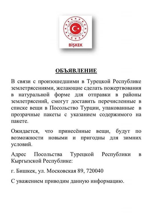 Отмечается, что те, кто желают сделать пожертвования в натуральной форме, могут их доставить в посольство Турции в Бишкеке.