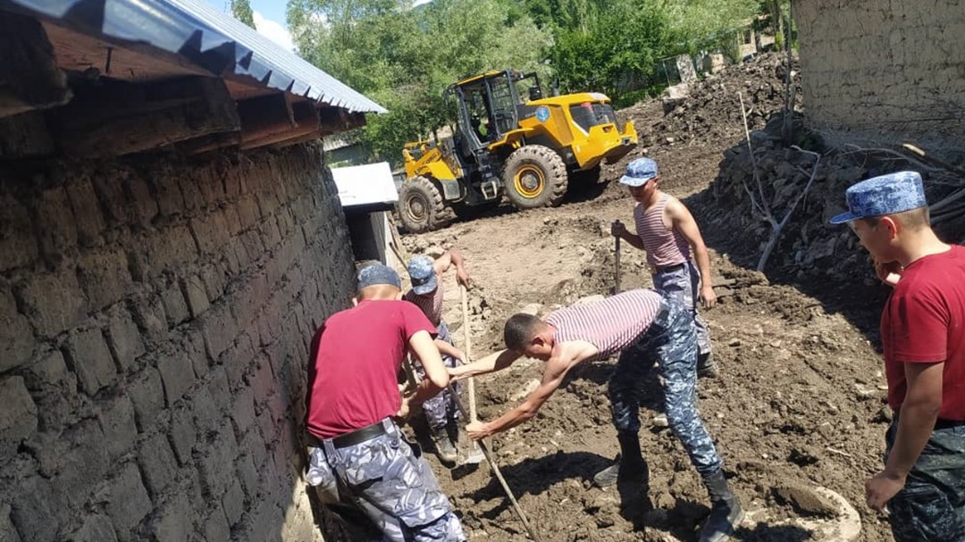 После получения информации о последствиях водной стихии на помощь жителям Узгенского района Ошской области направлены военнослужащие войсковой части 703 Внутренних войск МВД.