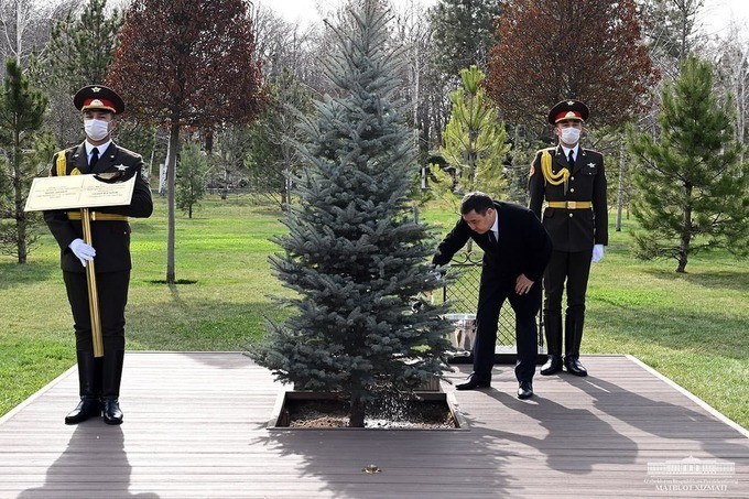 Шавкат Мирзиёев и Садыр Жапаров 12 марта высадили дерево на Аллее почетных гостей в резиденции Куксарой.