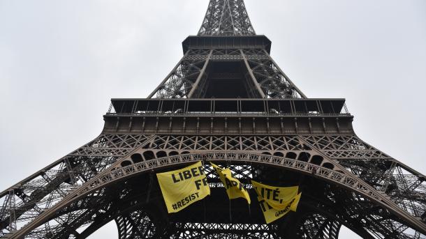 В преддверии второго тура президентских выборов во Франции активисты Greenpeace развернули на Эйфелевой башне в Париже большую растяжку с национальным девизом Франции «Свобода. Равенство. Братство».