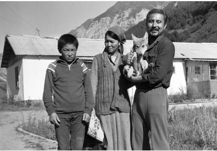 Фотография актера Дуйшенбека Байдоботова с волчонком, казахстанской актрисы Рахилям Машуровой и одного из сельских подростков была сделана в 1988 году в Ошской области.