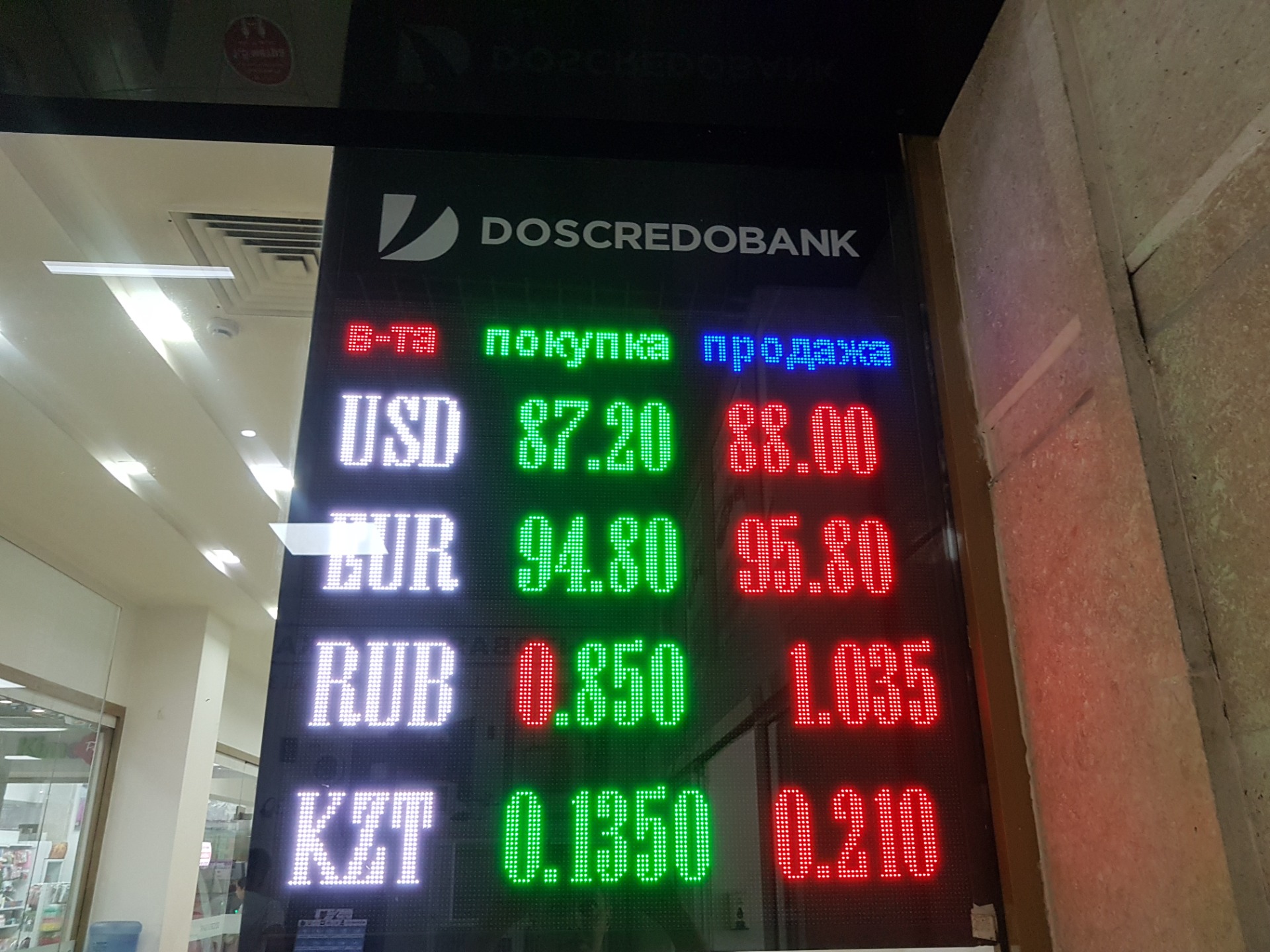 Он стоит 0,85 сома. Официальные курсы евро, доллара и тенге стабильны.