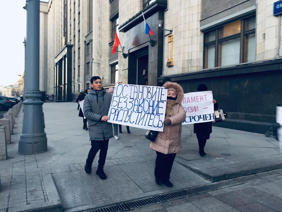 Отмечается, что кыргызстанцы вышли на акцию протеста из-за приезда и. о. президента Таланта Мамытова в столицу России.