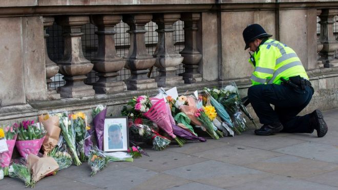 Жители Лондона приносят цветы на место нападения в память о погибших.