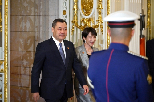 Далее Президент Садыр Жапаров и Премьер-министр Японии Санаэ Такаити прошли по красной дорожке вдоль выстроенной роты почетного караула и после совместного фотографирования перешли в зал для участия в приветственном ужине в честь лидеров стран Центральной Азии.