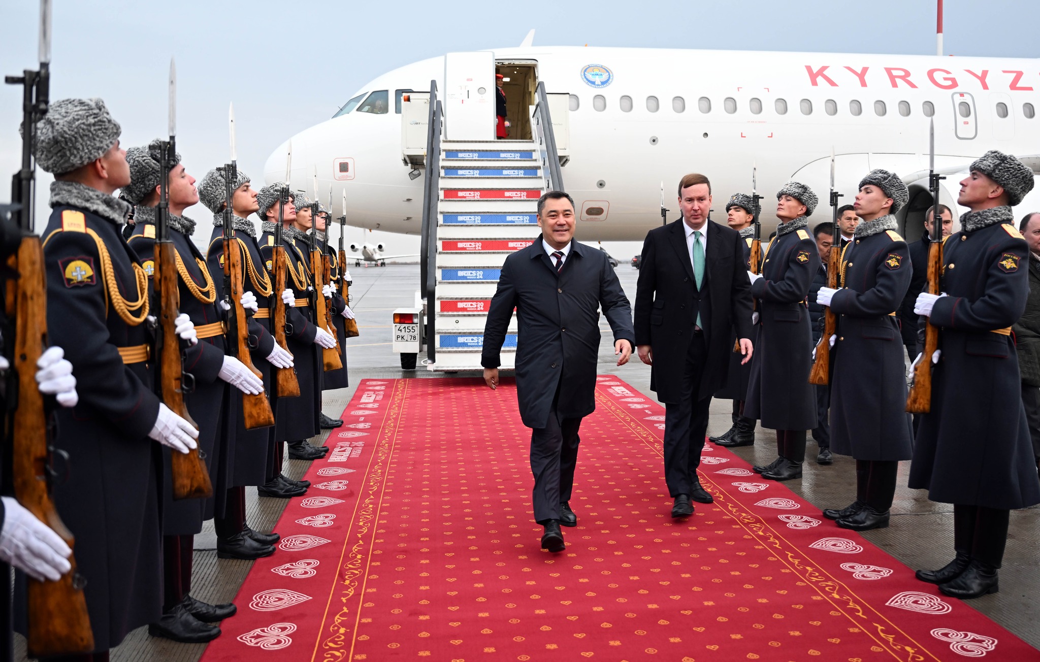 В аэропорту были вывешены флаги государств-членов БРИКС, расстелена ковровая дорожка, выстроен почетный караул. Девушки в национальных костюмах, приветствуя Садыра Жапарова, преподнесли национальные угощения.