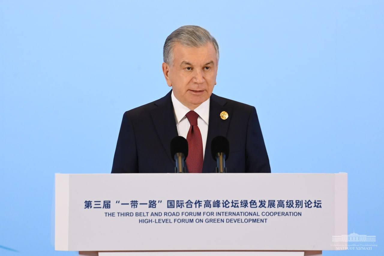 Президент Республики Узбекистан Шавкат Мирзиёев 18 октября в городе Пекине принял участие в церемонии открытия третьего Международного форума «Один пояс, один путь» и его пленарном заседании на тему «Совместное строительство «Зеленого» шелкового пути в интересах гармоничного сосуществования человека и природы».