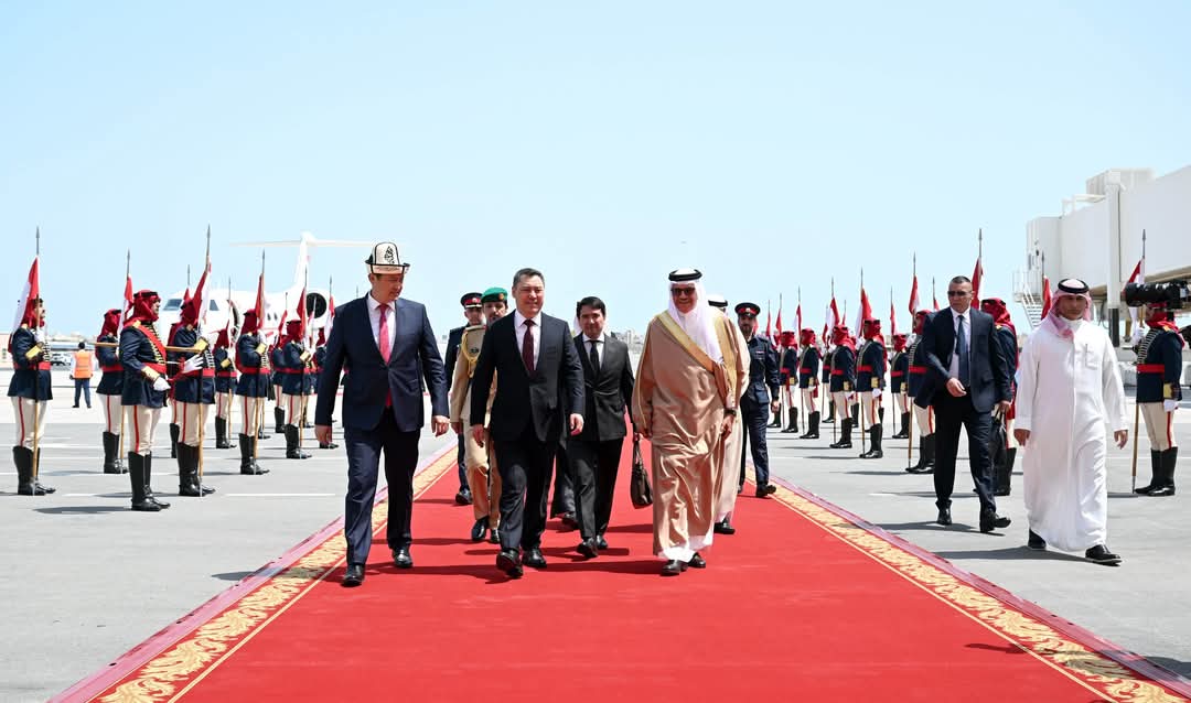 Президента Садыра Жапарова встретил министр иностранных дел Королевства Бахрейн Абдуллатиф бин Рашид Альзаяни и другие официальные лица.