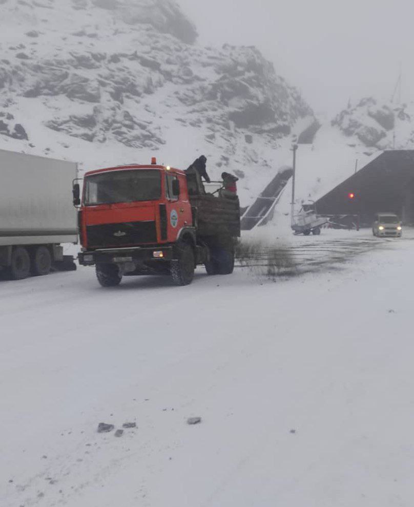 Из-за снега на перевале Тоо-Ашуу введены ограничения на проезд большегрузных авто. Ограничения снимут, когда погодные условия улучшатся.